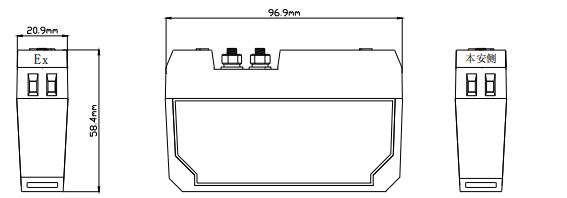 安全栅采用统一的外形和安装尺寸,安全栅电路用环氧树脂浇封在壳体内,各接线端子间的爬电距离、电气间隙及材料的相对泄痕指数均符合GB 3836.1及GB 3836.4的有关要求。安全栅外形示意图如下图所示。
